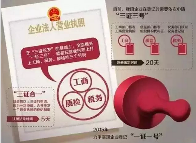 2015年10月1日起,“三證合一、一照一碼”登記制度改革在全國推行,稅務總局日前發布通知明確了相關銜接事項。其中規定,“三證合一”后,新設立企業、農民專業合作社領取由工商行政管理部門核發加載法人和其他組織統一社會信用代碼的營業執照后,無需再次進行稅務登記,不再領取稅務登記證。